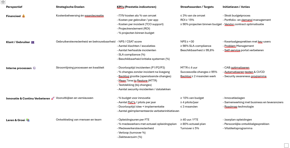 Er zijn veel indicatoren die je op een IV Balanced Scorecard kunt opnemen. Hieronder staan er een aantal.